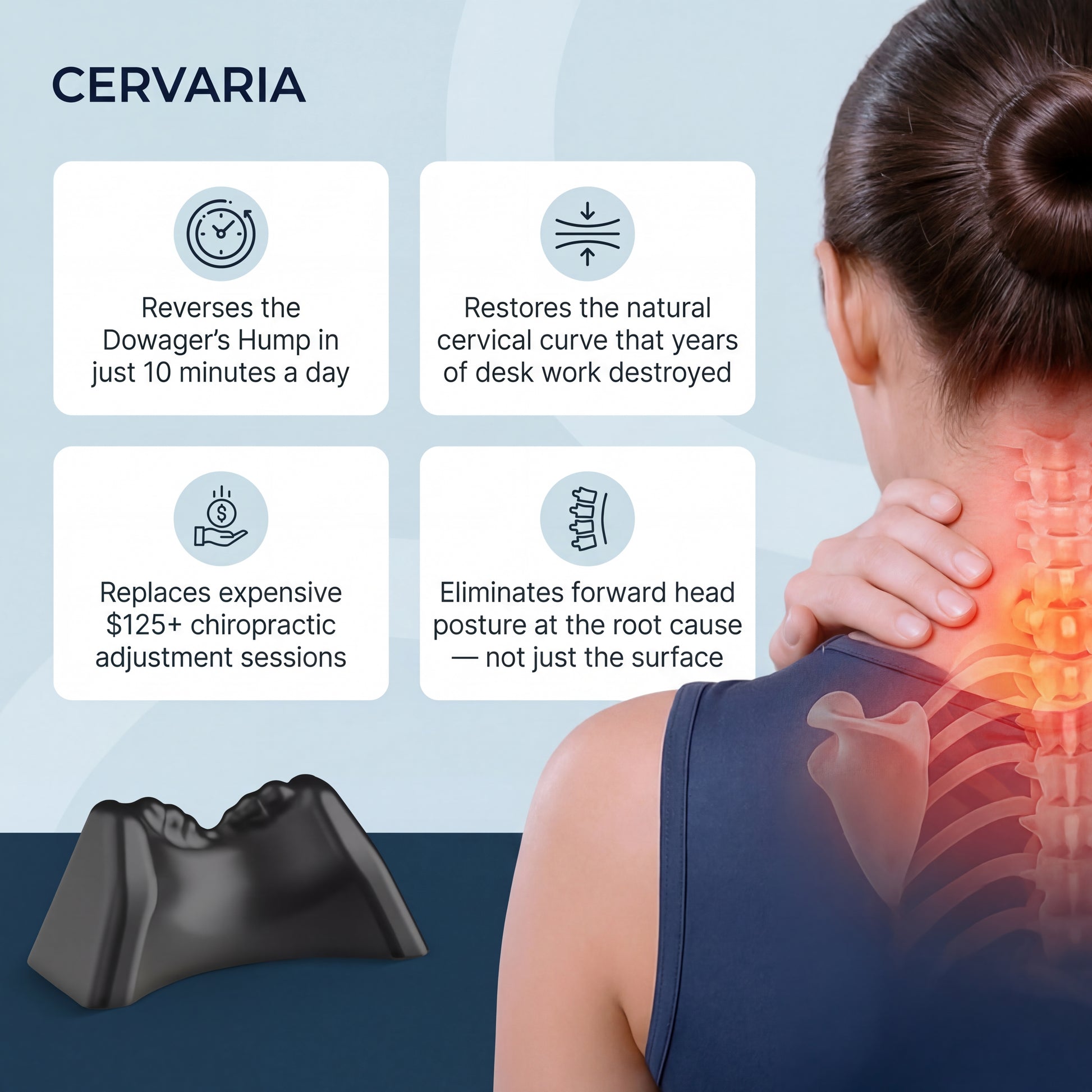 The hump doesn't just live in your neck — it starts where your neck meets your upper back. This base supports that junction directly, so the whole area decompresses at once, not just the surface.